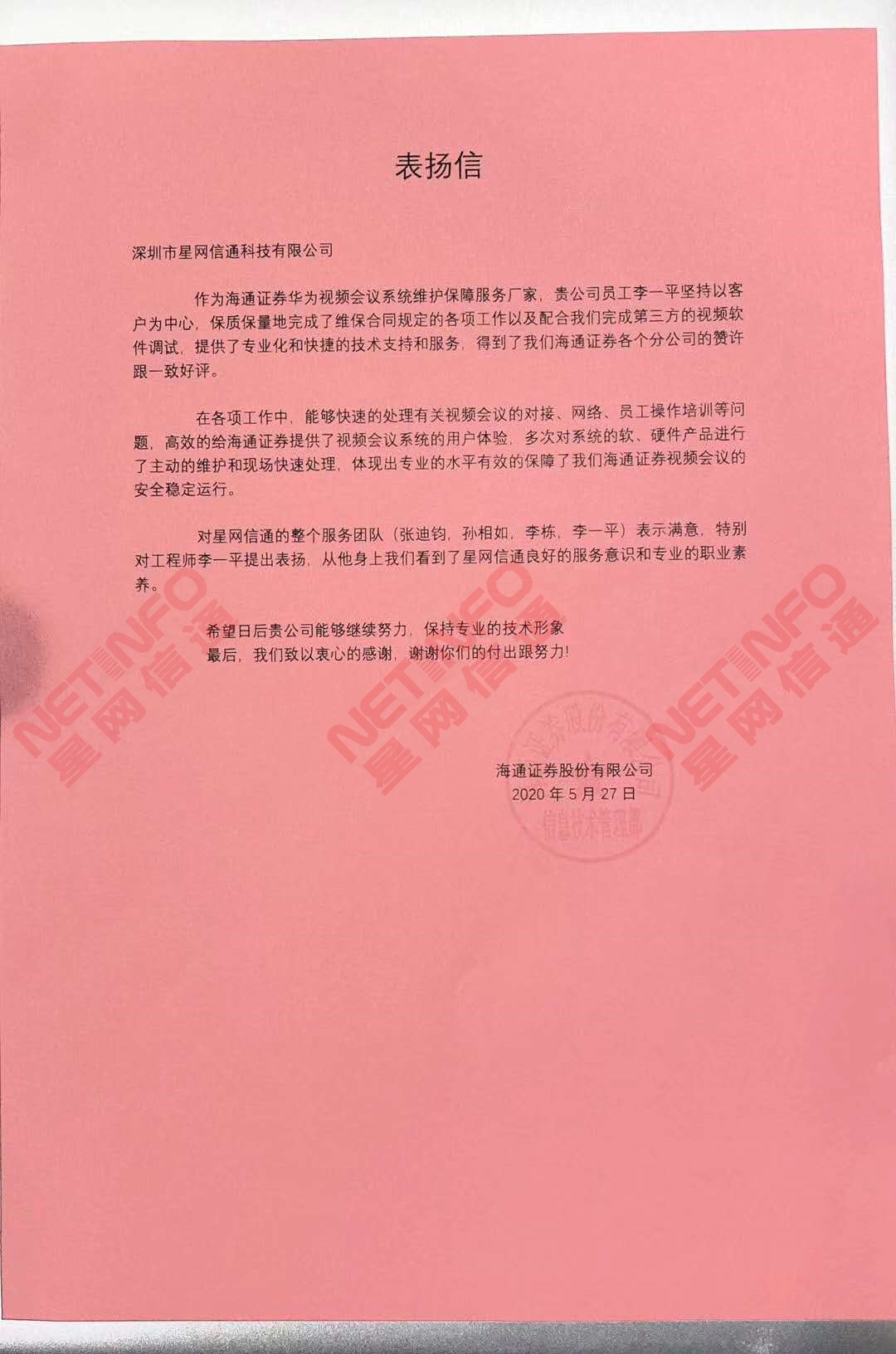 我司2020年承接的海通證券股份有限公司--華為視頻會議系統(tǒng)維護保障服務項目,在項目維護過程中,項目組成員體現了極強的專業(yè)素養(yǎng),克服了種種困難,圓滿提前完成了任務,獲得了客戶極高的評價和認可。客戶的滿意是星網信通存在的最大價值,我們感謝海通證券股份有限公司對我司工作的認可,并會再接再厲,以專業(yè)態(tài)度服務 用真誠感動客戶!