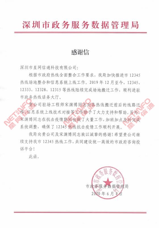 我司2019年承接的深圳市政府--12345熱線項目,在項目過程中,我司駐場工程師體現了極強的專業素養,克服了種種困難,圓滿提前完成了任務,獲得了客戶極高的評價和認可。客戶的滿意是星網信通存在的最大價值,我們感謝深圳市政府對我們的認可與信任,這無疑是對我們最大的鼓勵。星網會努力做得更好,只為了給客戶最好的守護,做您最強的后盾。
